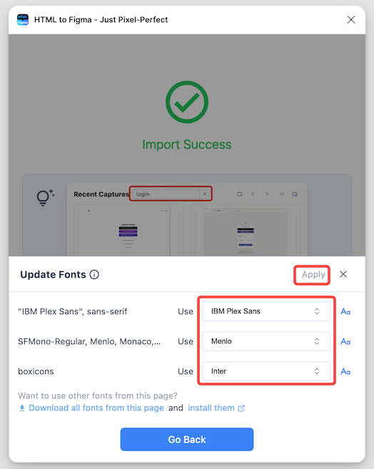 By default, after the import is completed, the HTML to Figma plugin displays all the fonts declared in the webpage, along with the actual fonts used during import, as a list.